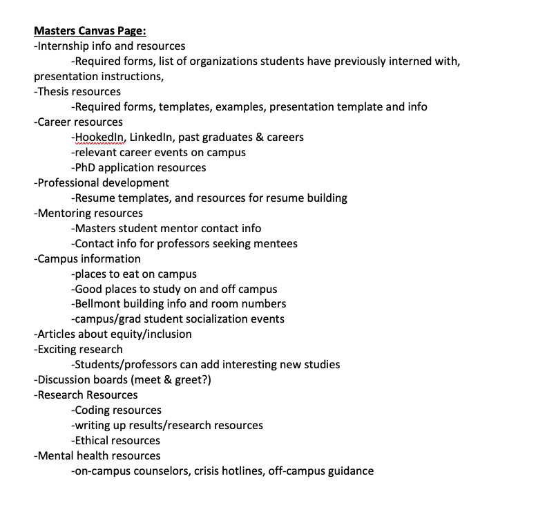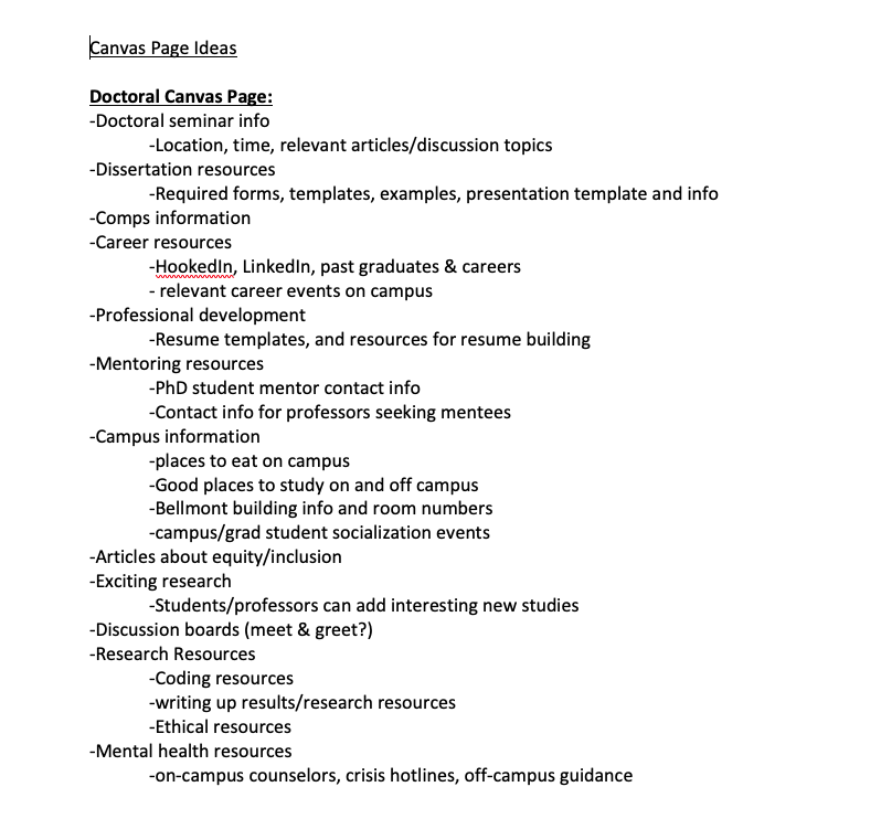 Below are my notes taken during focus groups in each classroom. I came in with ideas to present, and got feedback for each topic. I also asked the students if they had new ideas and would add them as well. I organized my notes by whether the students were doctoral or master’s level, as they would have separate pages.